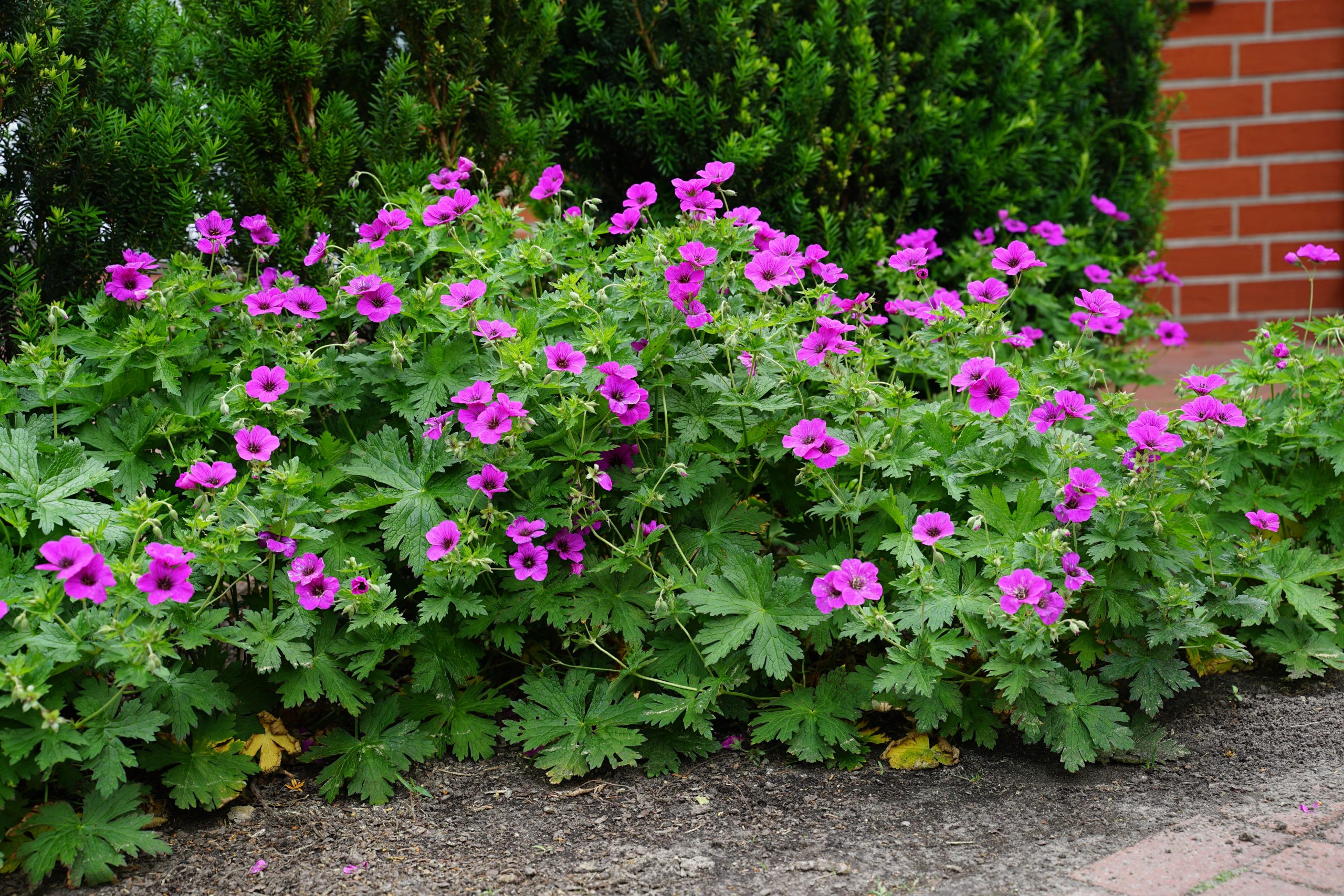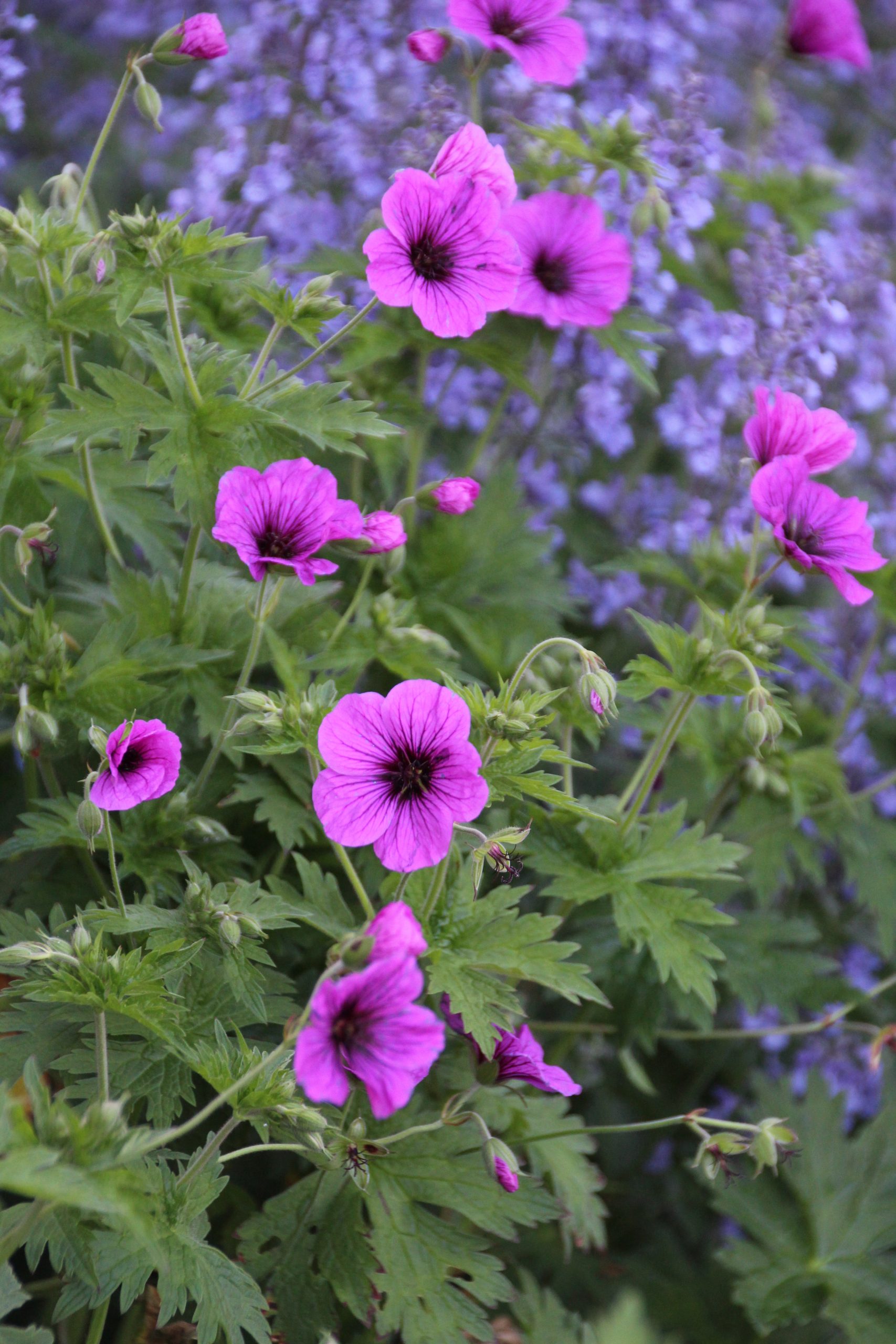 violett-rot, schwarzes Auge, V-VI, 40 cm, Blatt grün, sonnig, mittel, horstig, Pflanzabstand 45 cm