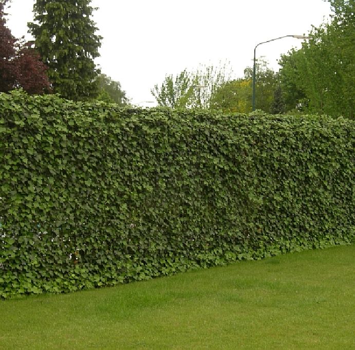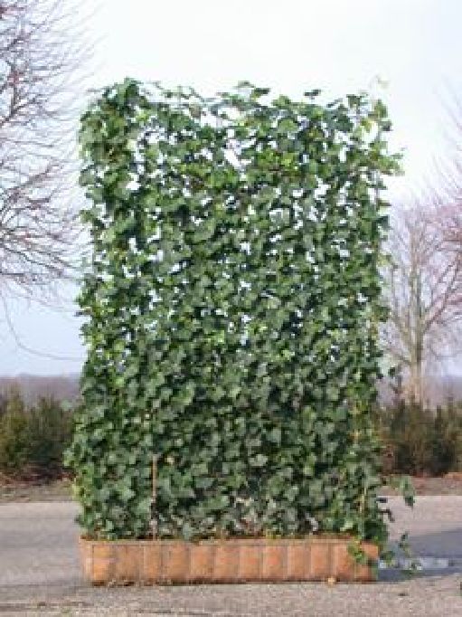 Die Fertighecke von Mobilane besteht aus einem vollständig mit (Kletter-)Pflanzen begrünten Stahlgitter. Die Hecke wird in einem biologisch abbaubaren Pflanzgefäß aus Kokossubstrat herangezogen.