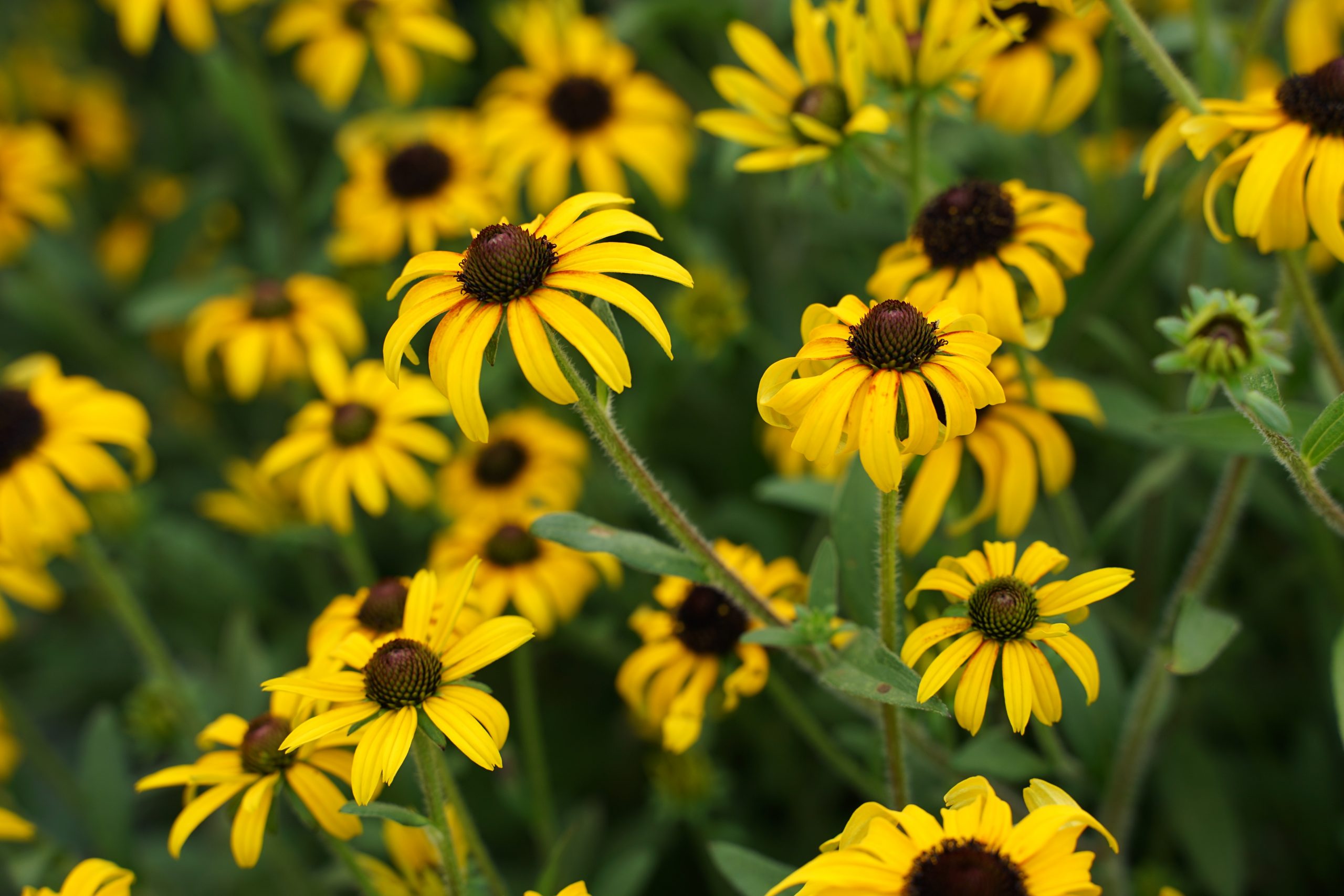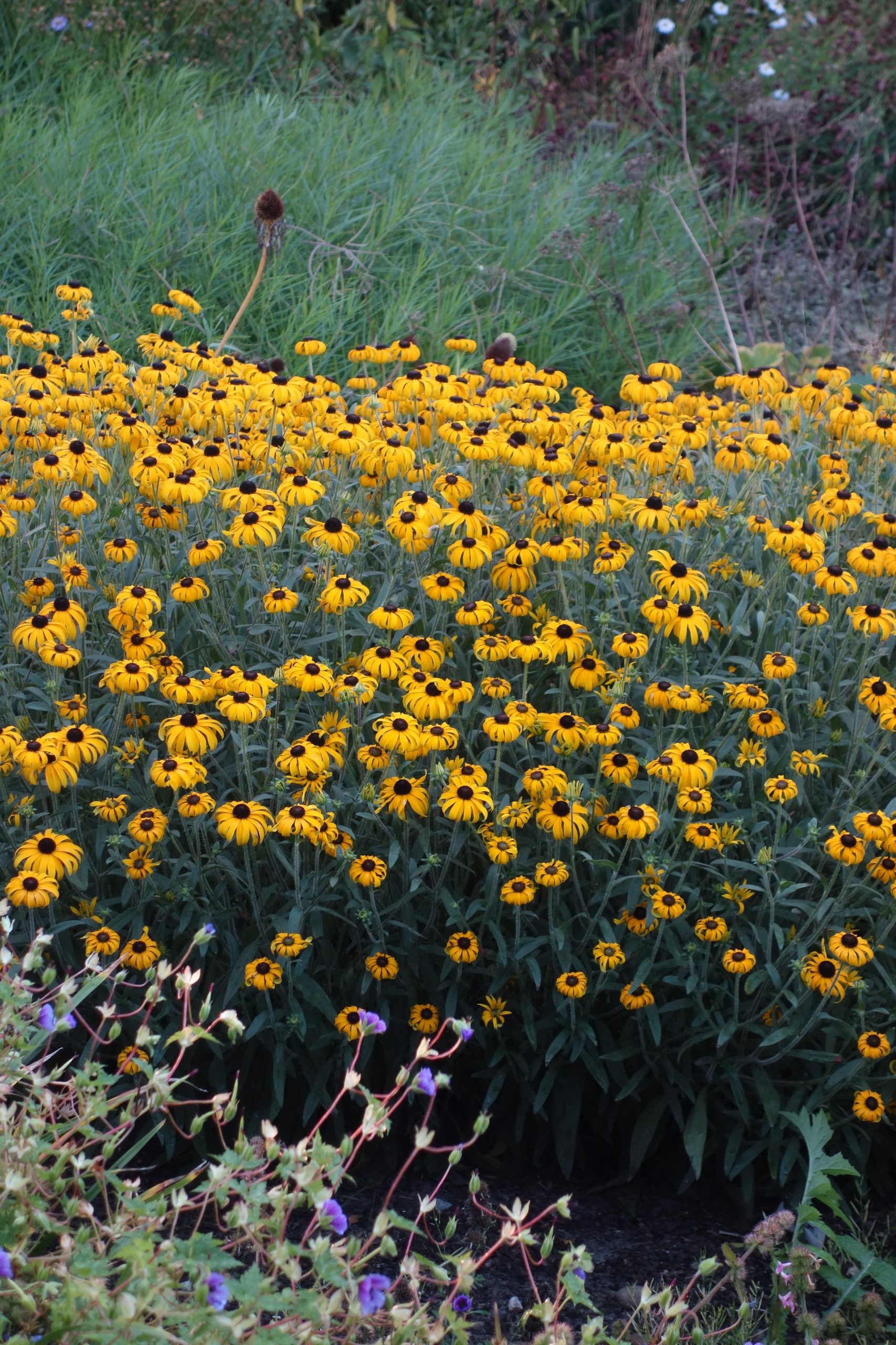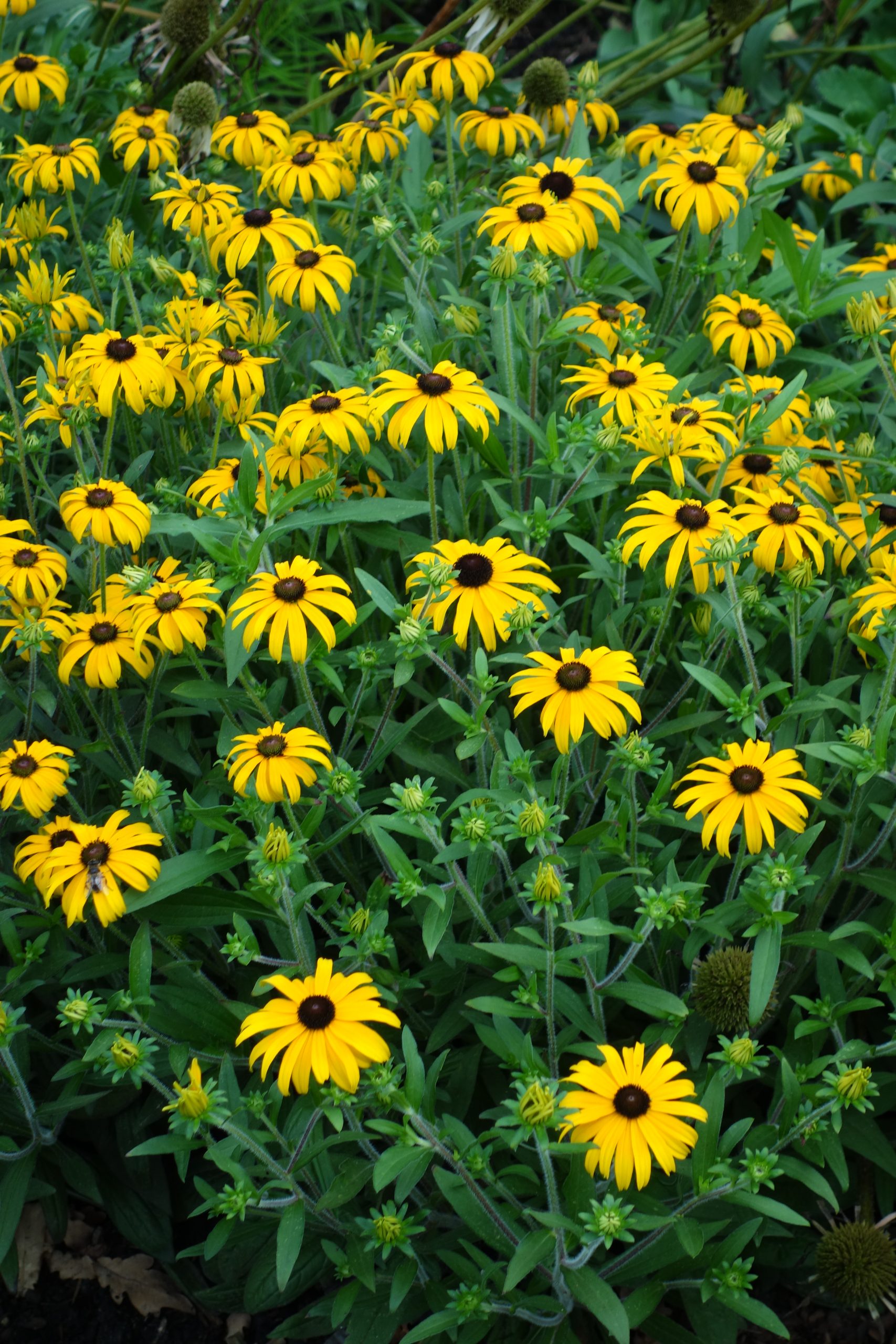 gelb, schwarze Mitte, VII-IX, 60 cm, Blatt grün, sonnig, mittel, horstig, Pflanzabstand 45 cm